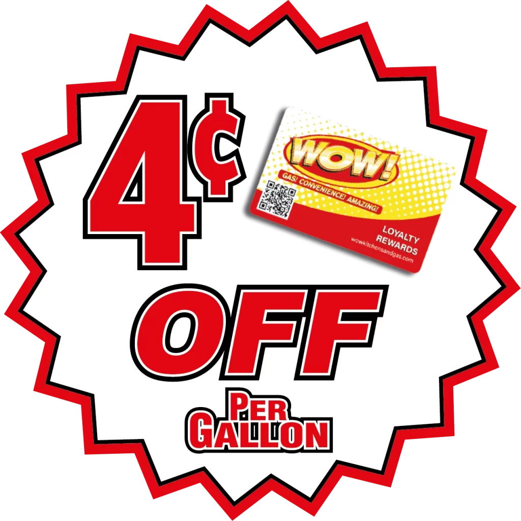 Join our WOW! Loyalty Rewards program and save $0.04/gallon every time you fuel up with us. Plus, get exclusive deals and save money on your favorite in-store items including cigarettes, snacks, beverages and more!